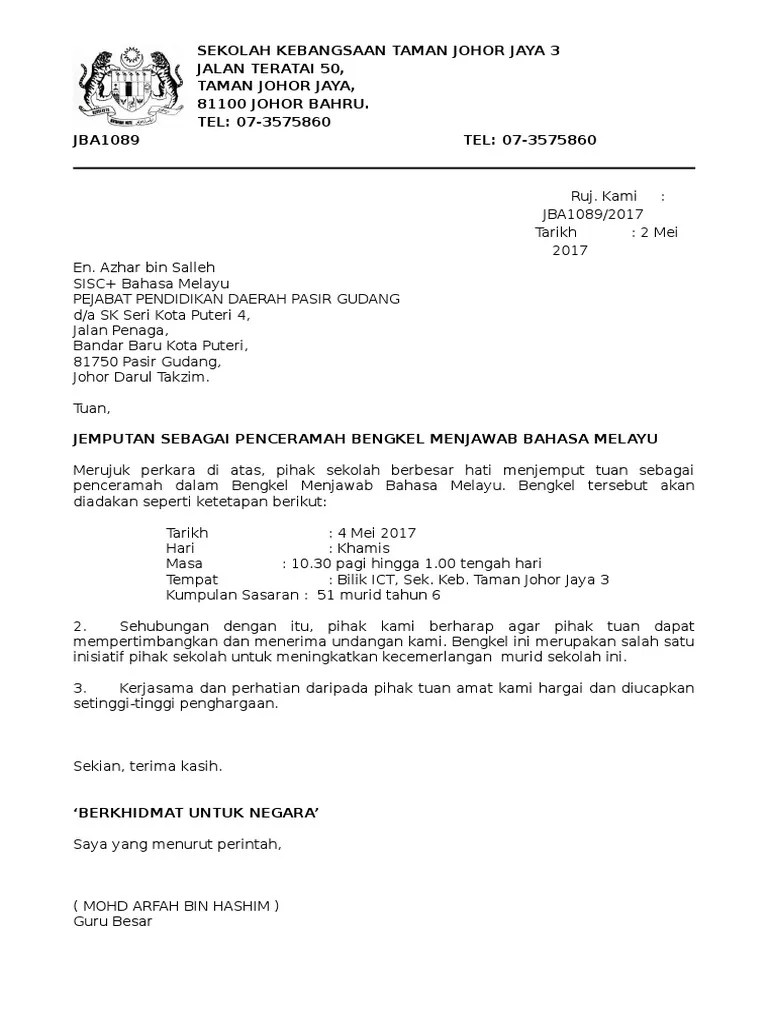Contoh surat rasmi jemputan ceramah rasmi h surat jemputan penceramah. Surat jemputan penceramah bengkel bahasa melayu spm.